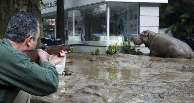 Hayvanat bahçesinden kaçan bir su aygırı kentin ana meydanında uyuşturucu tabancayla yakalandı.